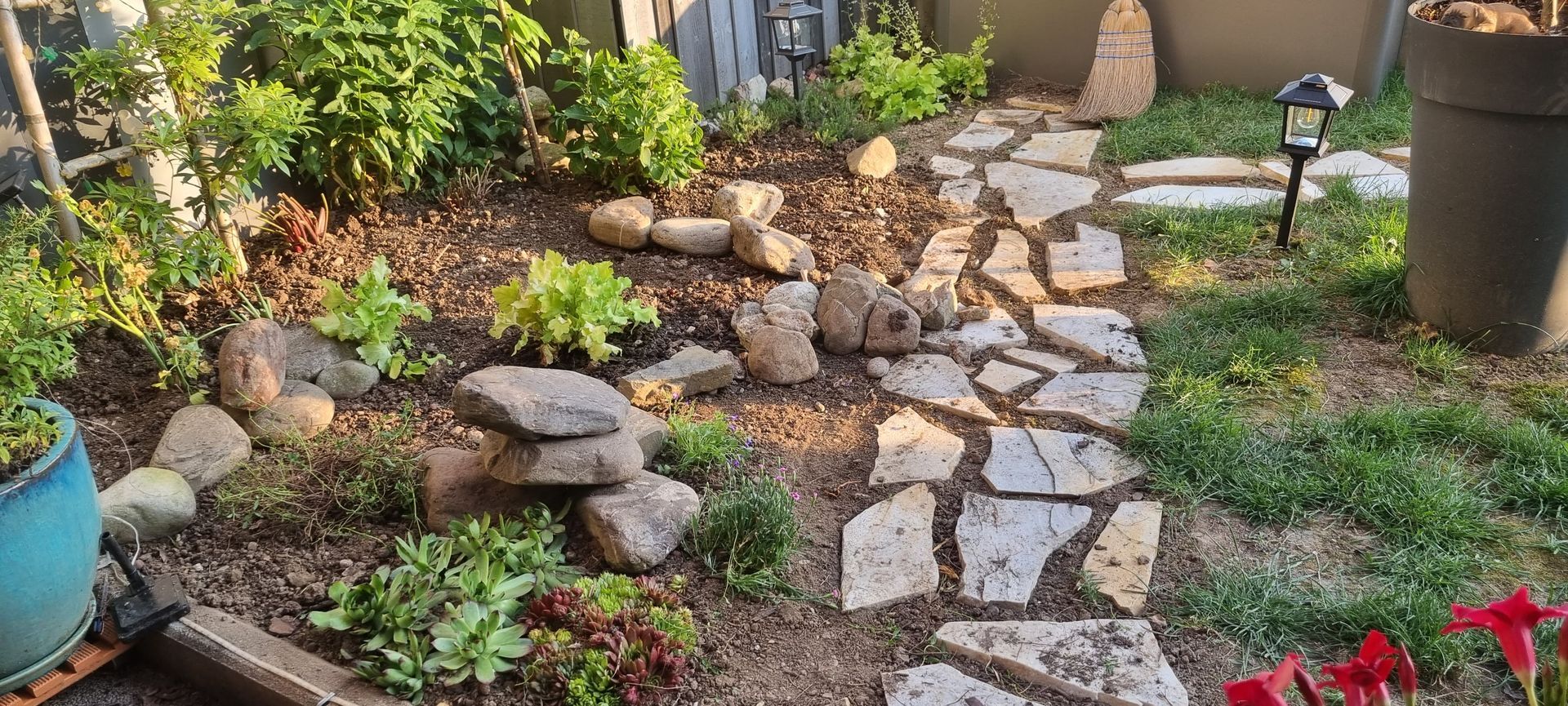 Pose de pierres du lac, de pierres volcaniques, et installation de petites dalles pour structurer vos espaces extérieurs.
